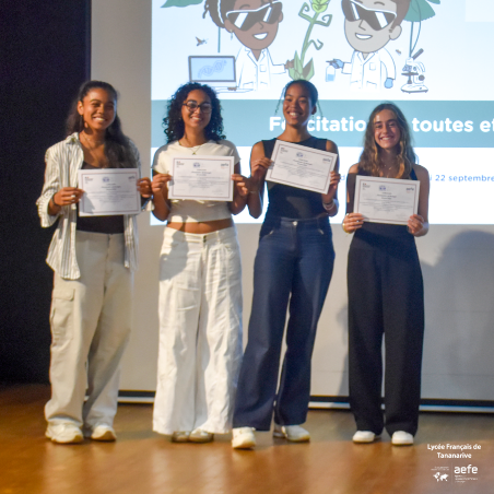Le 22 septembre 2025, une cérémonie a été organisée afin de féliciter les deux équipes. En présence du proviseur, M. Hosni, et les élèves ont eu l’honneur de recevoir leurs diplômes et attestations des mains de Mme Sabine Bobée, IA-IPR de SVT de l’AEFE pour la zone Océan Indien.